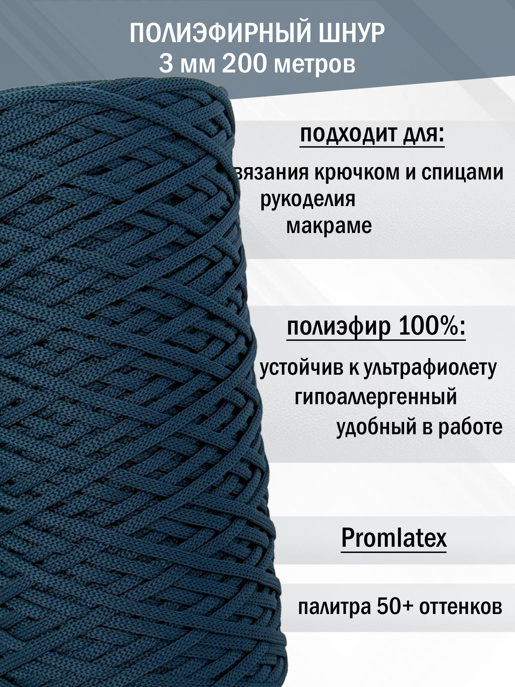Полиэфирный шнур 3 мм (+/-0,5) от компании Promlatex (Промлатекс) — это материал, открывающий безграничные возможности для творчества и рукоделия. Благодаря своим свойствам, он идеально подходит для создания широкого спектра изделий.