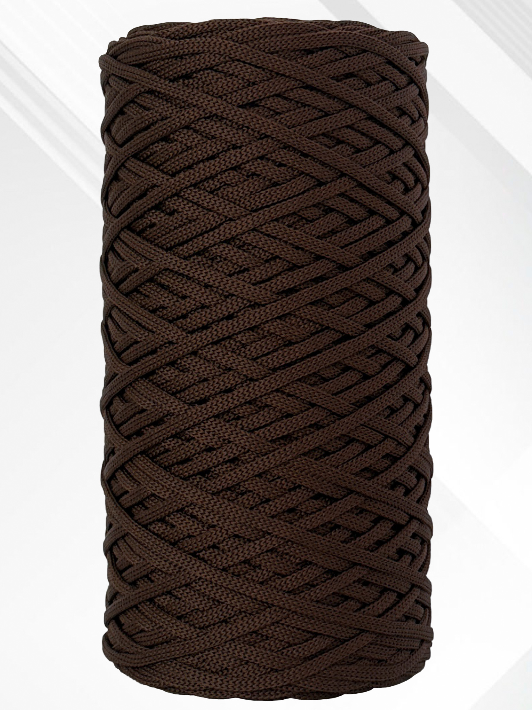 Этот полиэфирный шнур плоский, без сердечника и имеет небольшое растяжение, что придает ему отличную гибкость и легкость. Благодаря этим характеристикам он прекрасно подходит как для вязания крючком и спицами, так и для плетения в технике макраме.