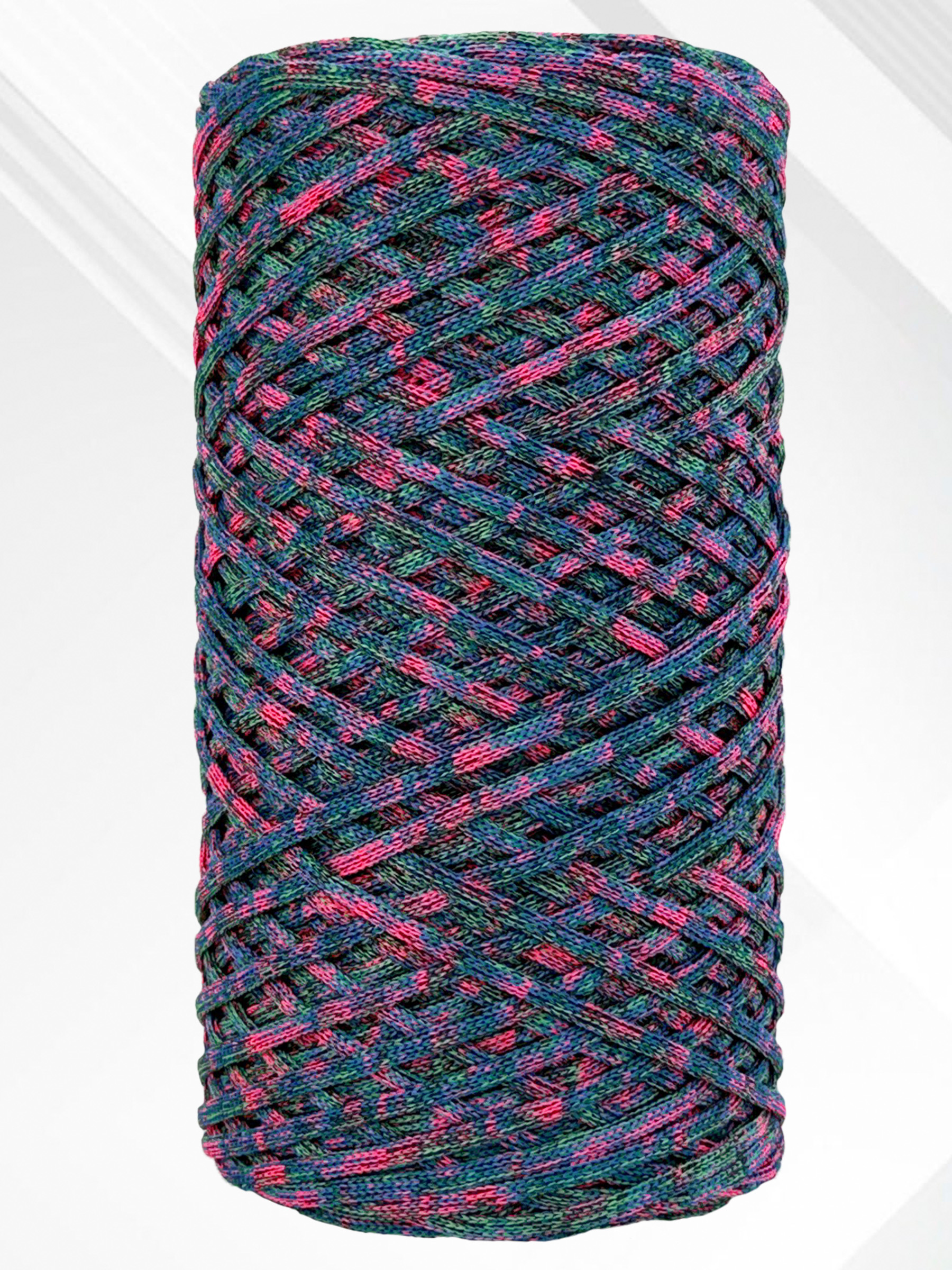 Этот полиэфирный шнур плоский, без сердечника и имеет небольшое растяжение, что придает ему отличную гибкость и легкость. Благодаря этим характеристикам он прекрасно подходит как для вязания крючком и спицами, так и для плетения в технике макраме.
