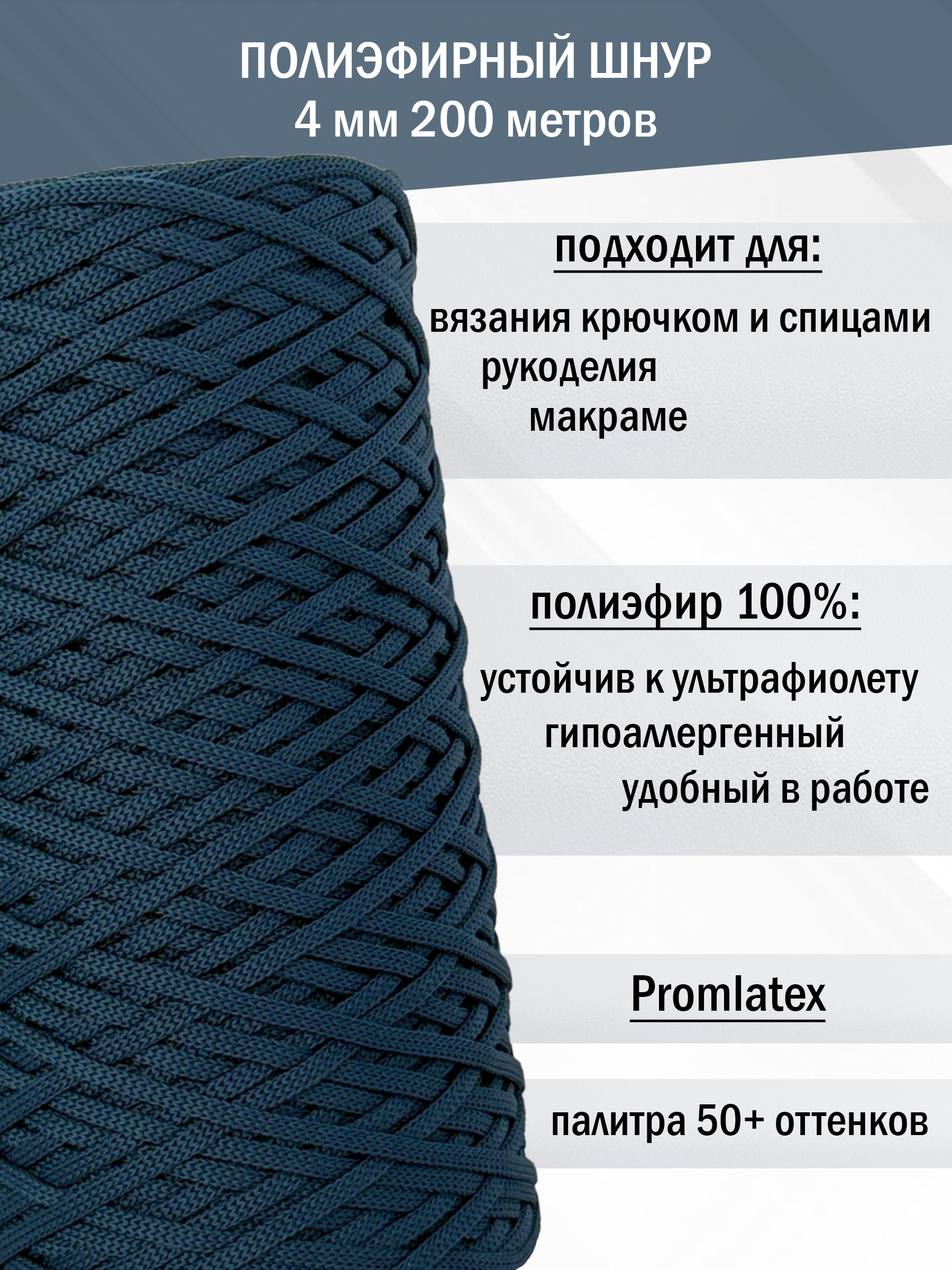 Полиэфирный шнур 4 мм (+/-0,5) от компании Promlatex (Промлатекс) — это материал, открывающий безграничные возможности для творчества и рукоделия. Благодаря своим свойствам, он идеально подходит для создания широкого спектра изделий.