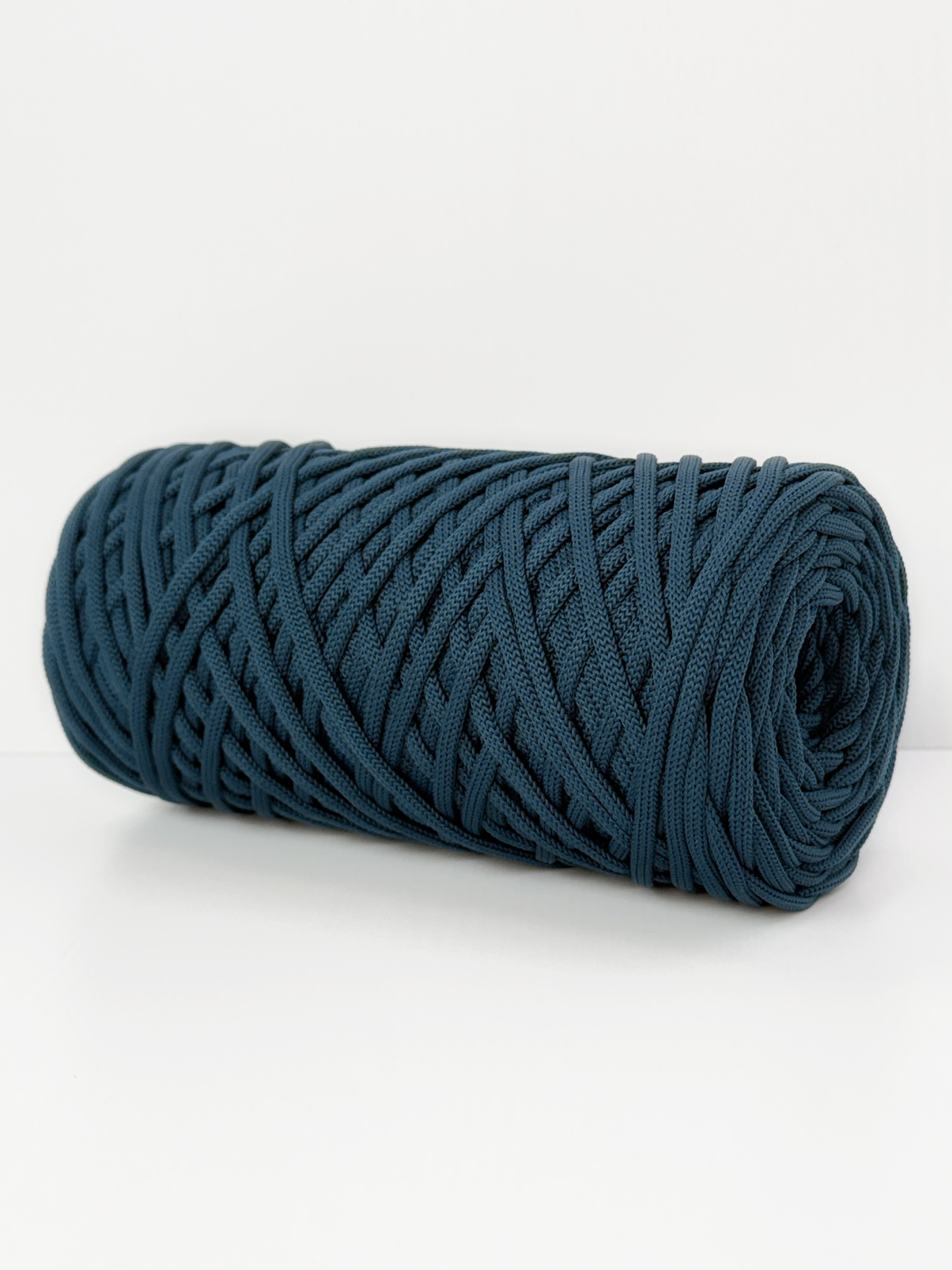 Этот шнур для вязания 5 мм полиэфирный отличается уникальным составом (полиэфир+спандекс), что придаёт ему объем и пружинистость. Сечение можно назвать овальным, у него отсутствуют четкие границы сгиба, как у плоского шнура. Это обеспечивает мягкость, делая шнур 5 мм подходящим для вязания крючком и спицами, а также для плетения в технике макраме.