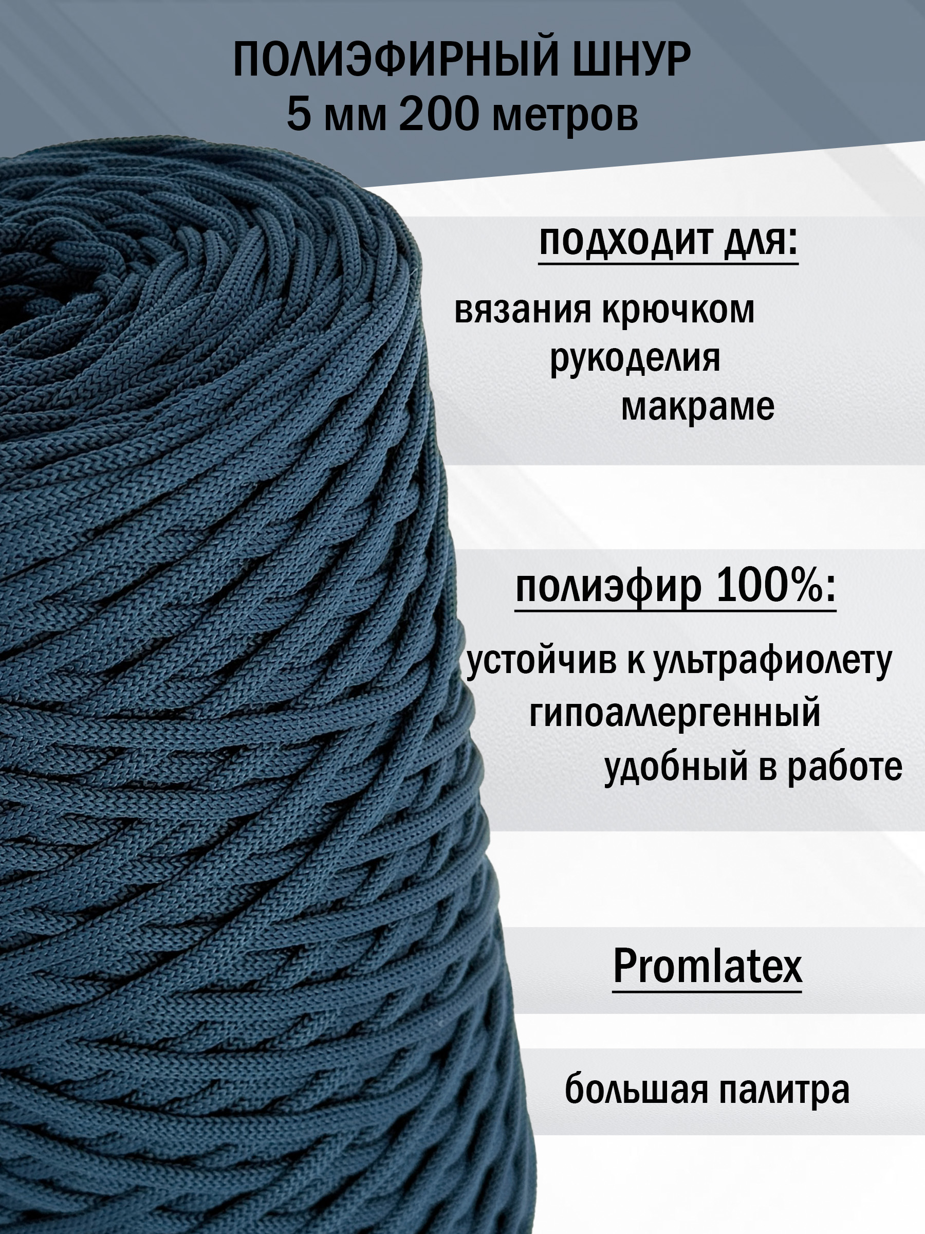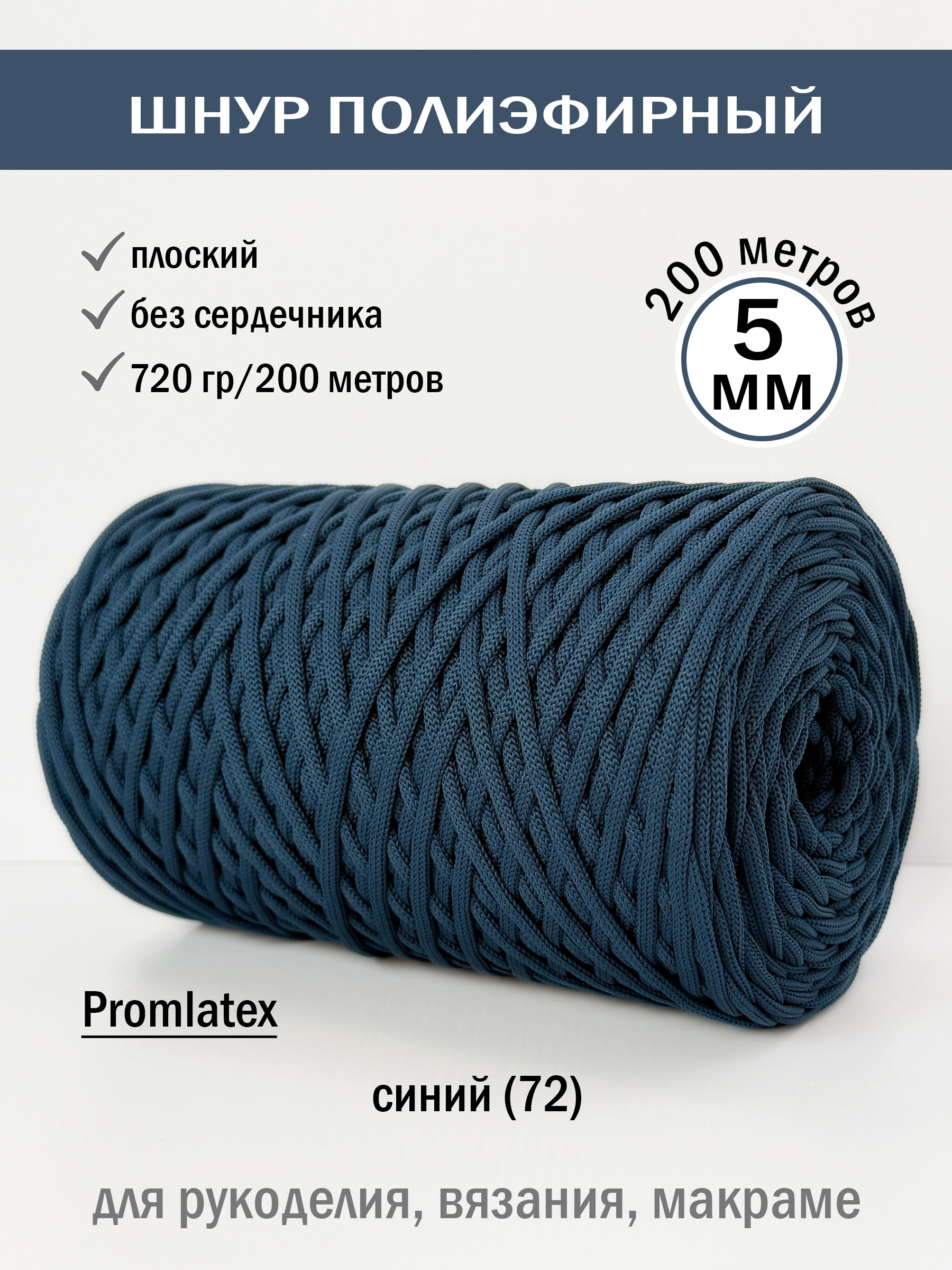 Полиэфирный шнур 5 мм без сердечника (+/-0,5) от компании Promlatex (Промлатекс) — это материал, открывающий безграничные возможности для творчества и рукоделия. Благодаря своим свойствам, он идеально подходит для создания широкого спектра изделий.
