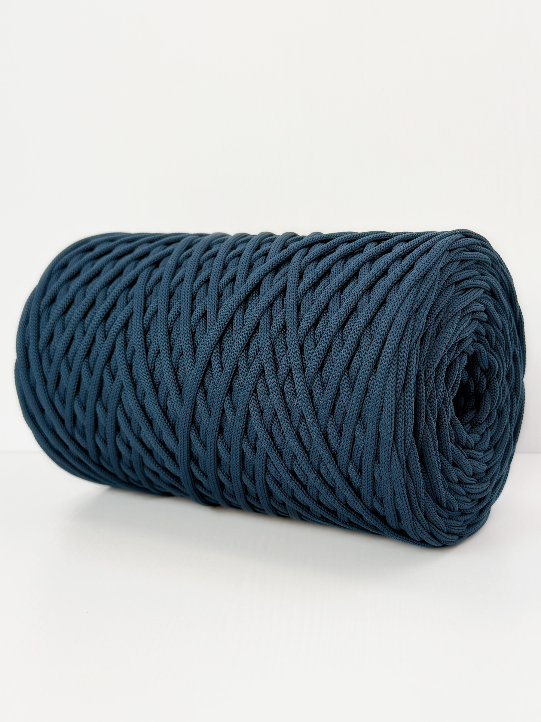 Этот шнур для вязания 5 мм полиэфирный отличается уникальным составом (полиэфир+спандекс), что придаёт ему объем и пружинистость. Сечение можно назвать овальным, у него отсутствуют четкие границы сгиба, как у плоского шнура. Это обеспечивает мягкость, делая шнур 5 мм подходящим для вязания крючком и спицами, а также для плетения в технике макраме.