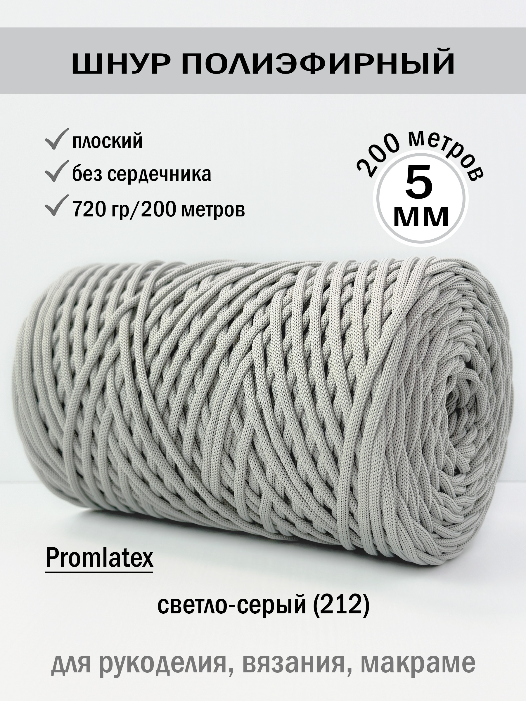 Полиэфирный шнур 5 мм без сердечника (+/-0,5) от компании Promlatex (Промлатекс) — это материал, открывающий безграничные возможности для творчества и рукоделия. Благодаря своим свойствам, он идеально подходит для создания широкого спектра изделий.