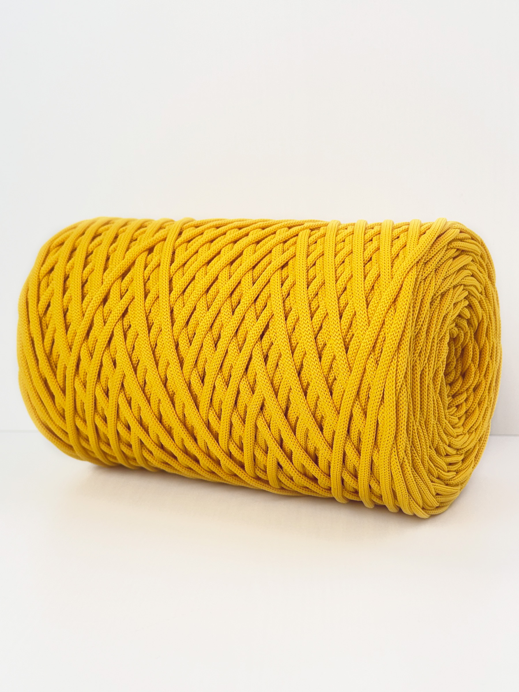 Этот шнур для вязания 5 мм полиэфирный отличается уникальным составом (полиэфир+спандекс), что придаёт ему объем и пружинистость. Сечение можно назвать овальным, у него отсутствуют четкие границы сгиба, как у плоского шнура. Это обеспечивает мягкость, делая шнур 5 мм подходящим для вязания крючком и спицами, а также для плетения в технике макраме.